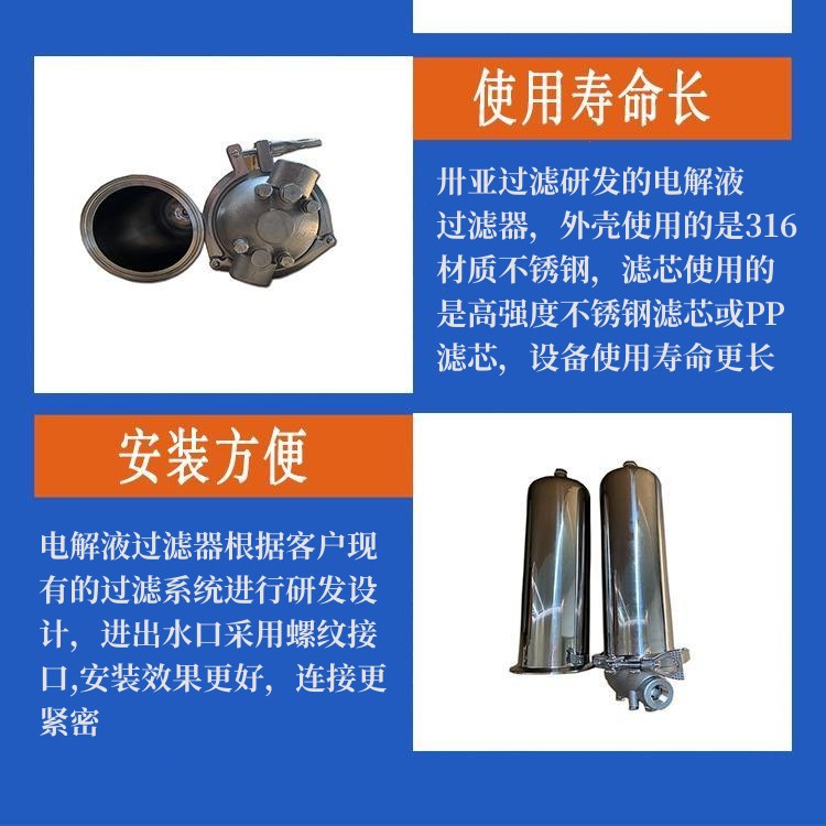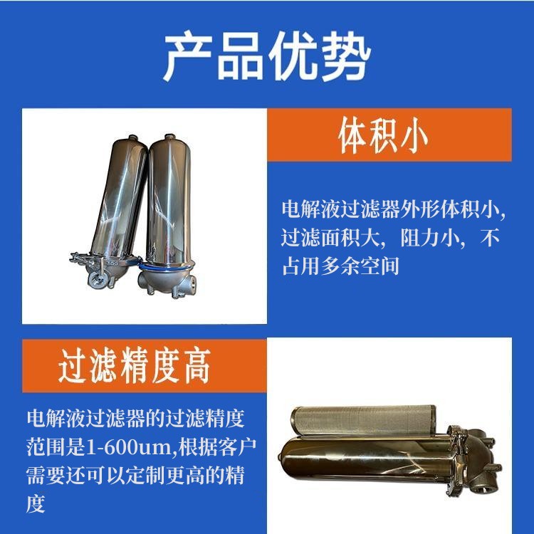 產品描述:不銹鋼濾芯式電解液過濾器是由304或者316材質不銹鋼制成,通常來說,為了確保過濾器運行的穩定,很多電池企業、汽車配件企業都會選擇316材質來定制過濾器.....